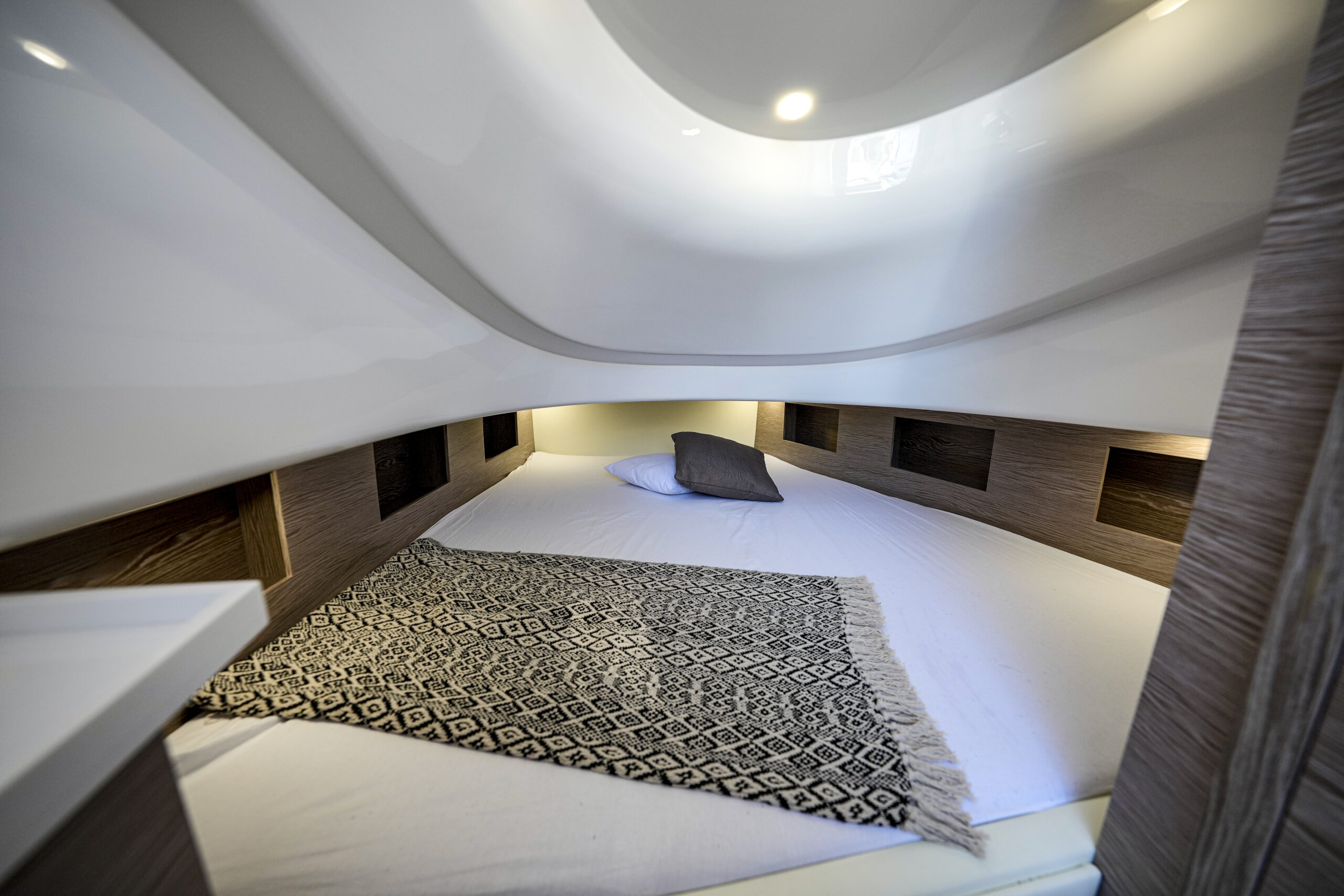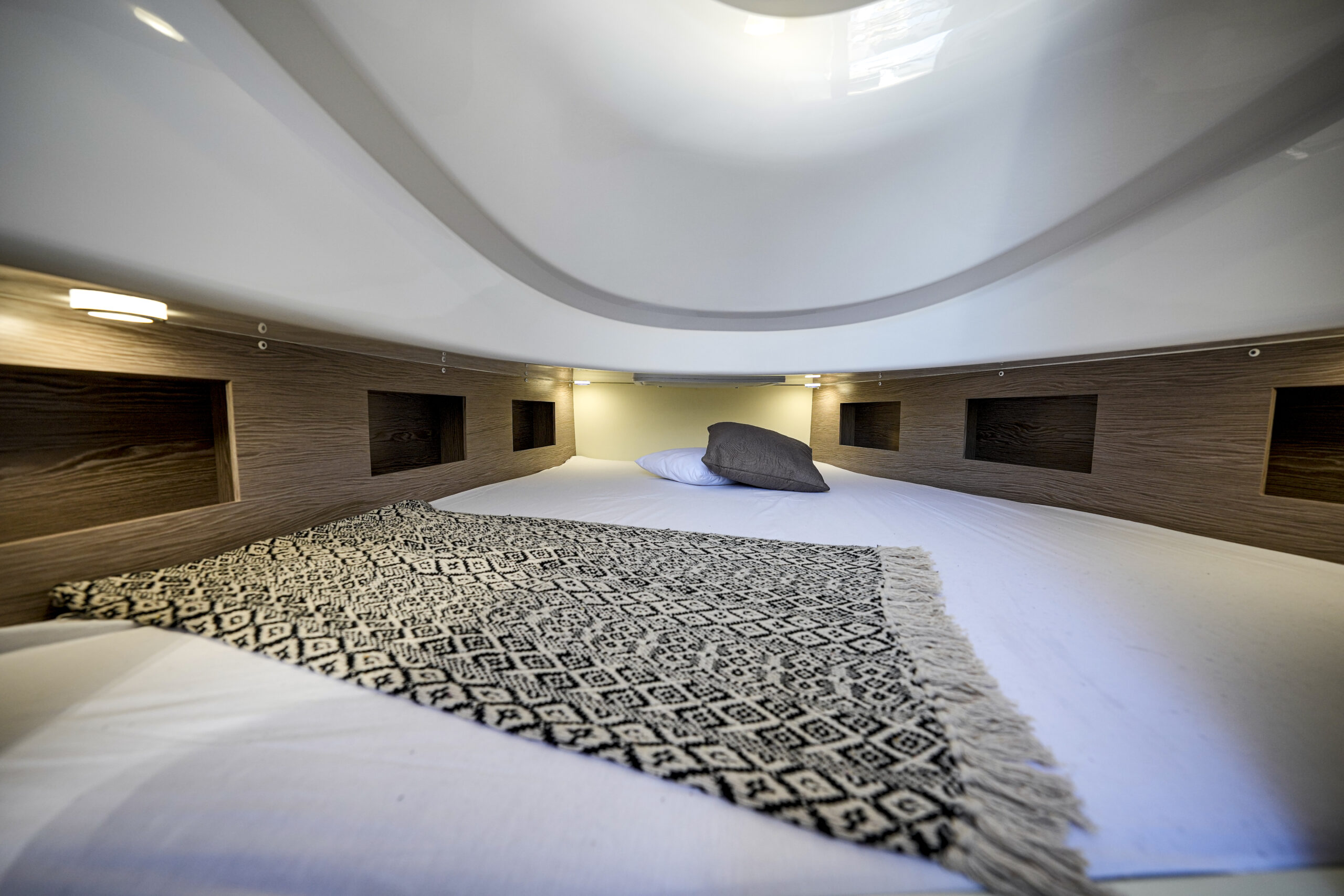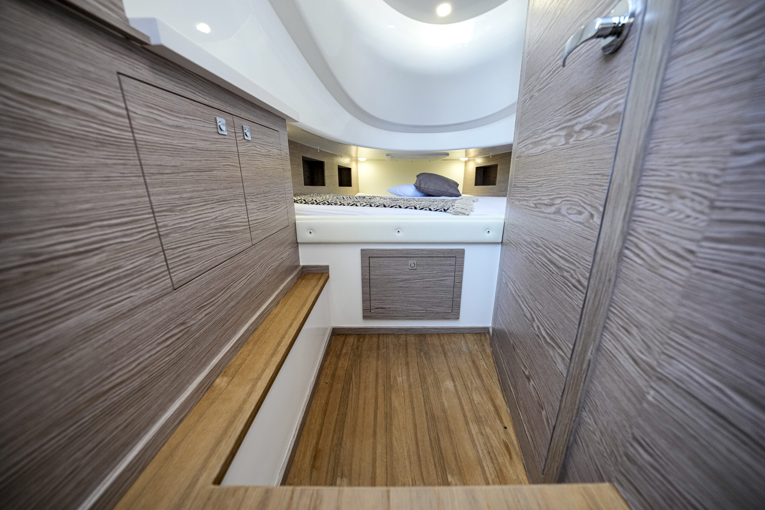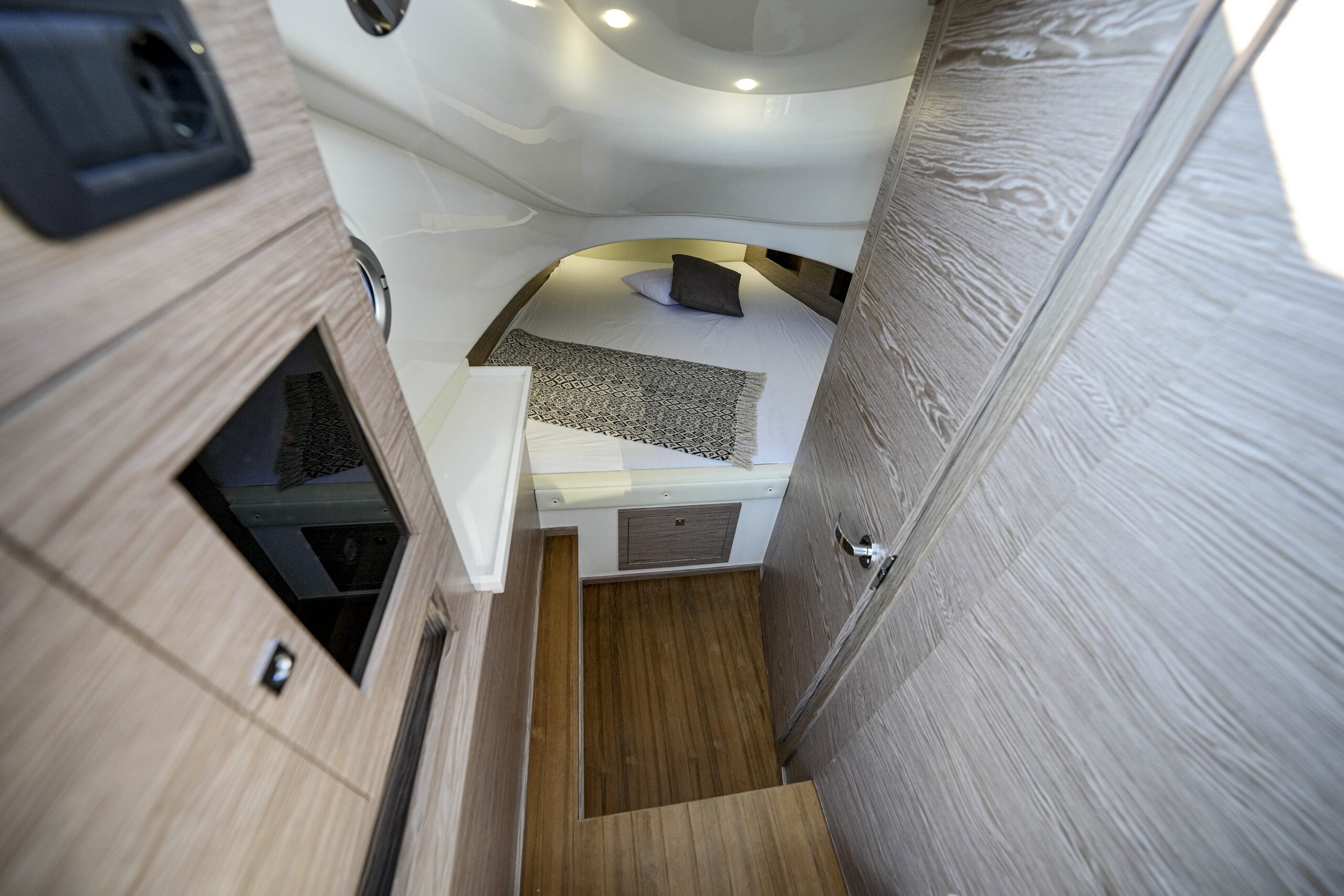 Die Sacs Strider 13 hat ein begehbares Teakdeck, eine Cockpitbar und einen großen Tisch aus Teakholz. Ein Highlight dieser Strider-Boote ist die Schwimmplattform. Eine große Fläche mit Teakholz bietet viel Platz zum Entspannen. Die Strider 13 ist außerdem mit einer elektrischen Badeleiter ausgestattet, um den Spaß an Bord mit viel Spaß im Wasser zu erweitern. Die Sacs Strider 13 ist mit großen Sonnendecks am Bug erhältlich. Eine geräumige Kabine Unterdeck in der Mitte des Schiffes ist mit einem riesigen Doppelbett und einem eigenen Bad ausgestattet.