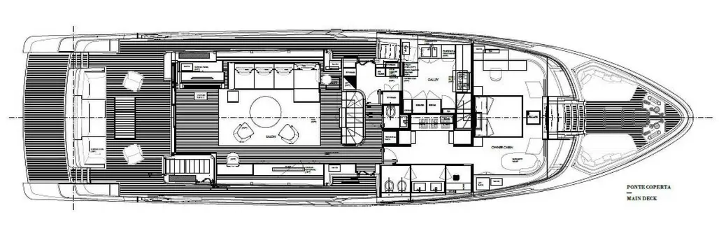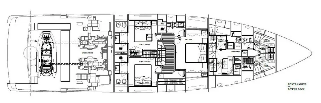 Auf drei Decks bietet sie Platz für bis zu acht Gäste in vier luxuriösen Kabinen, darunter eine Master-Suite über die komplette Schiffsbreite, eine VIP-Kabine und zwei Doppelkabinen, alle mit eigenem Bad. Im Verkauf inbegriffen ist ein 4,45 Meter langer Williams D445 Tender, der in einer eigenen Garage untergebracht ist, sowie eine Tauchausrüstung.